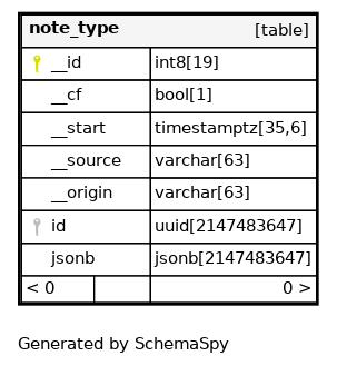 | Column | Type | Size | Nulls | Auto | Default | Children | Parents | Comments | ||