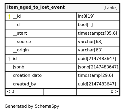 | item_aged_to_lost_event_pkey | Primary key | Asc | __id |