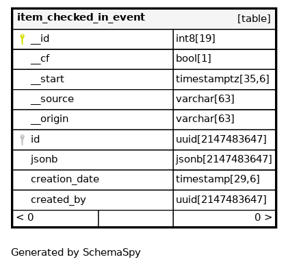 | item_checked_in_event_pkey | Primary key | Asc | __id |