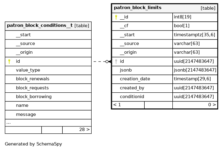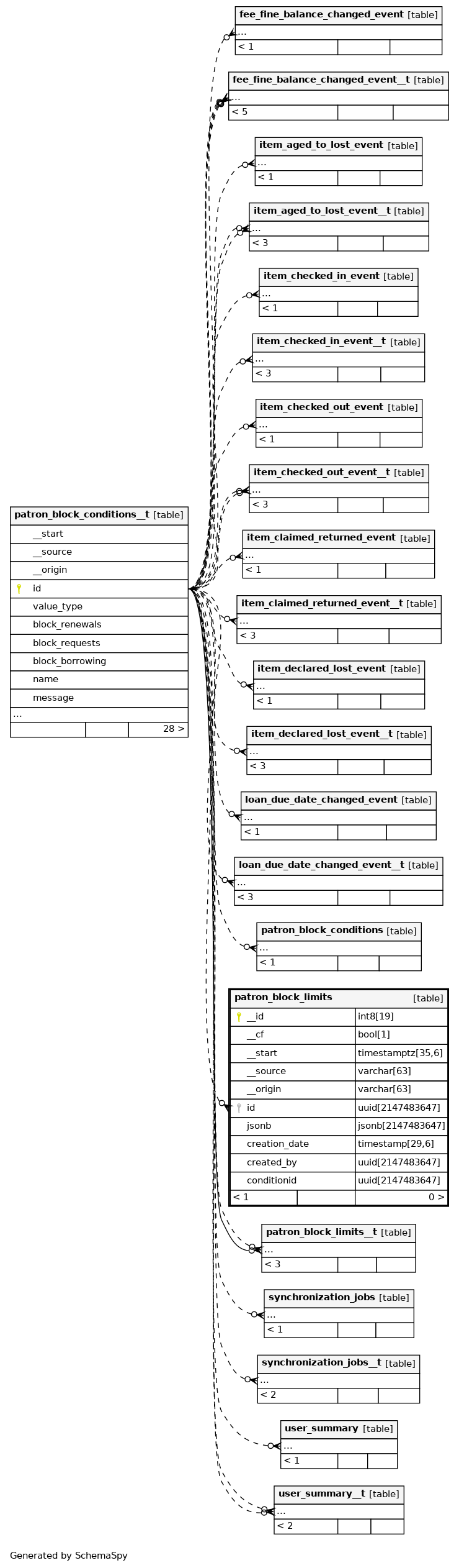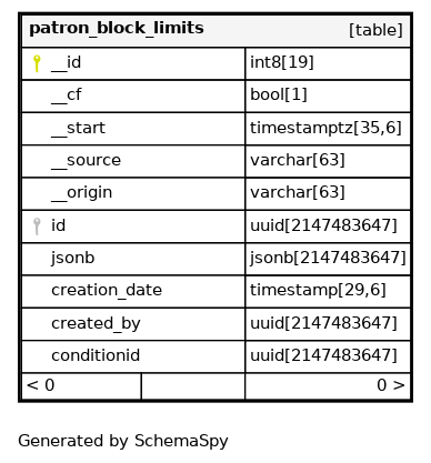 | patron_block_limits_pkey | Primary key | Asc | __id |