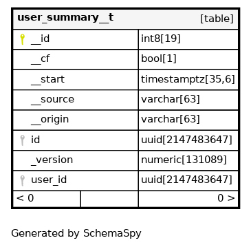 | user_summary__t_pkey | Primary key | Asc | __id |
